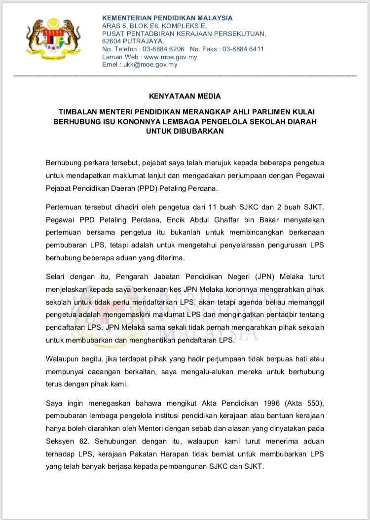 Kpm On Twitter Kenyataan Media Timbalan Menteri Pendidikan Merangkap Ahli Parlimen Kulai Berhubung Isu Kononnya Lembaga Pengelola Sekolah Diarah Untuk Dibubarkan 19 Julai 2018 Https T Co Sp9qbgbpzk Twitter